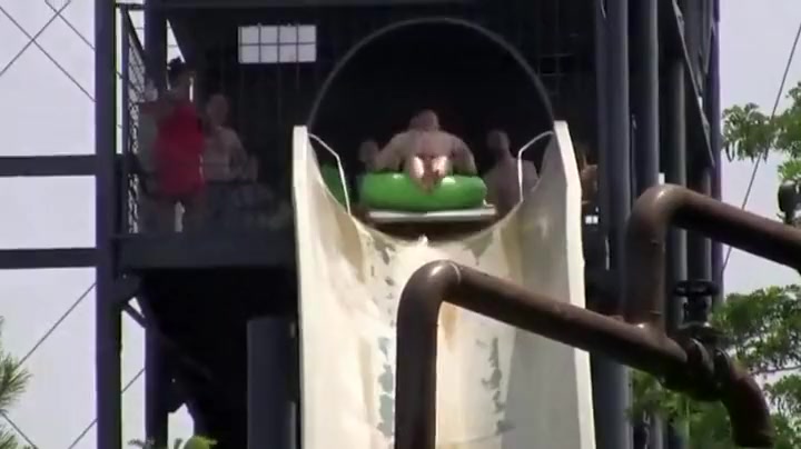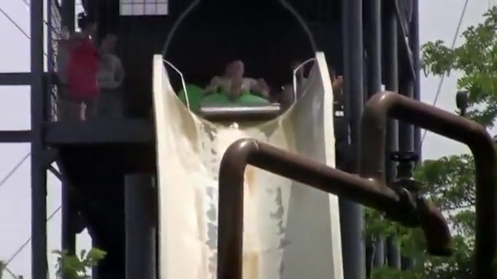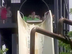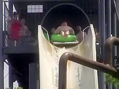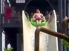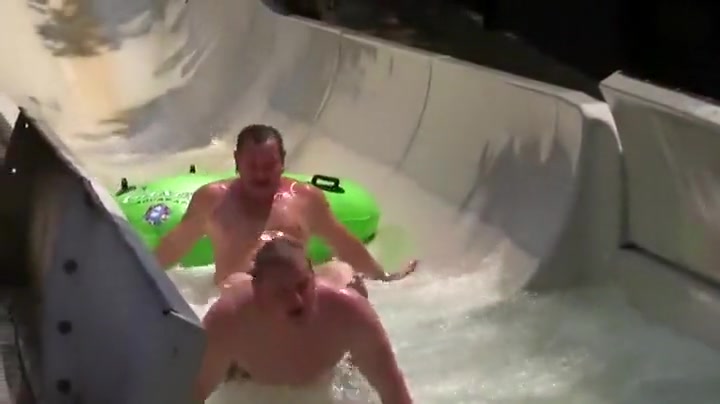 Two guys on a tube get some air and almost fly off the slide.