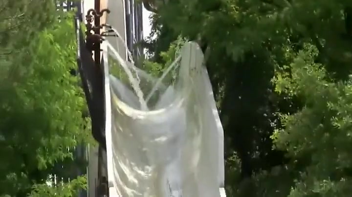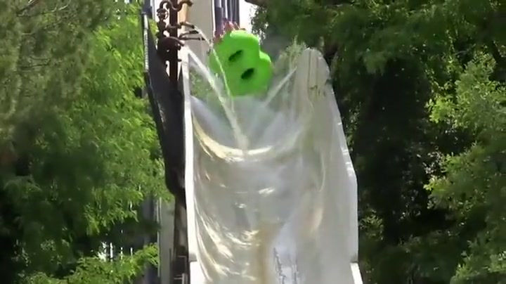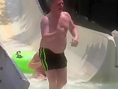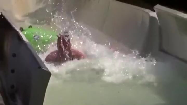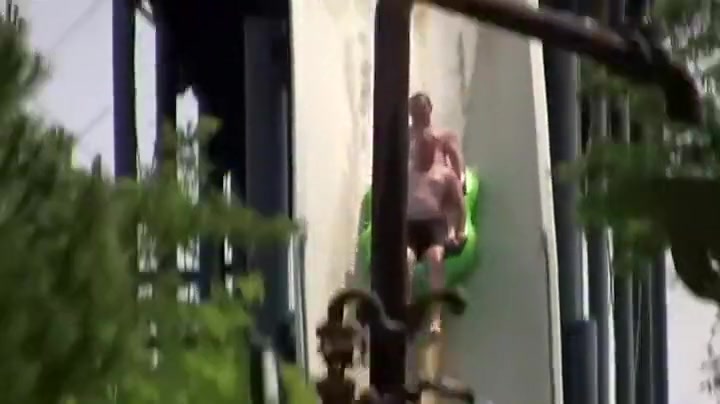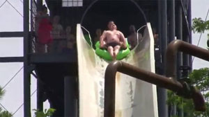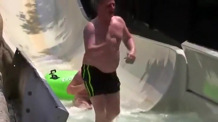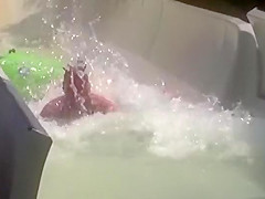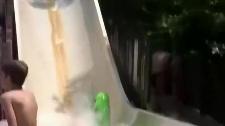 Two Guys Go Airborne On Water Slide