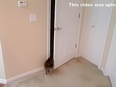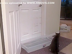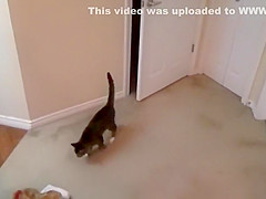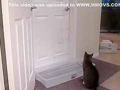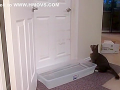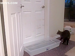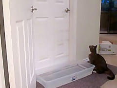 Not even a bucket of water is enough to stop this clever cat from opening the door.