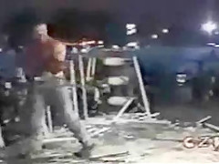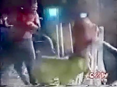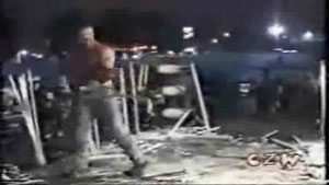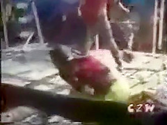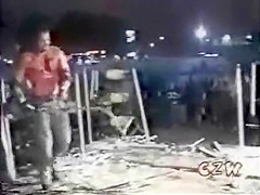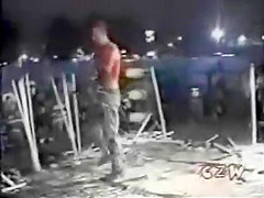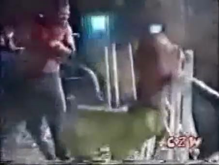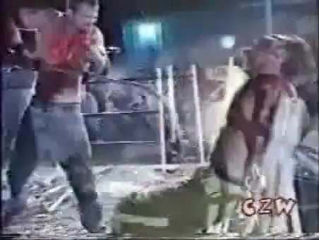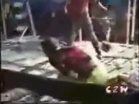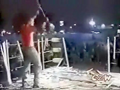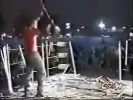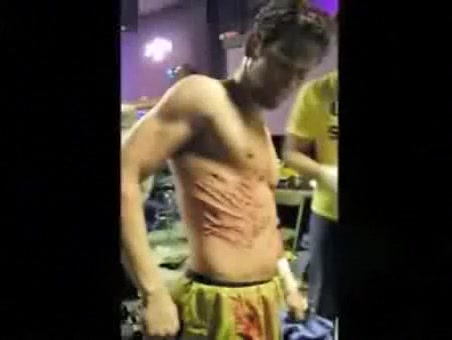 This is some extreme wrestling. I cant imagine how much this must have hurt. He is whipped with a weed wacker.