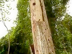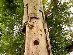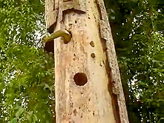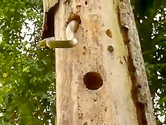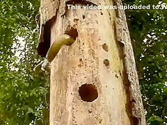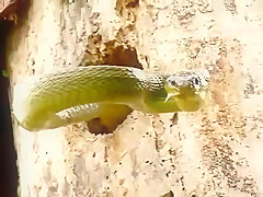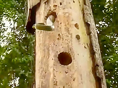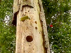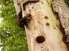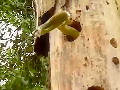 A crimson-crested woodpecker battles an olive whipsnake on Perus Yarapa River. One presumes that the snake was stealing eggs or attacking chicks in the woodpeckers nest.