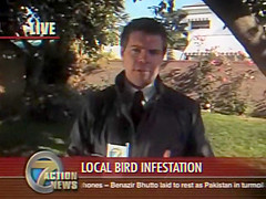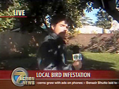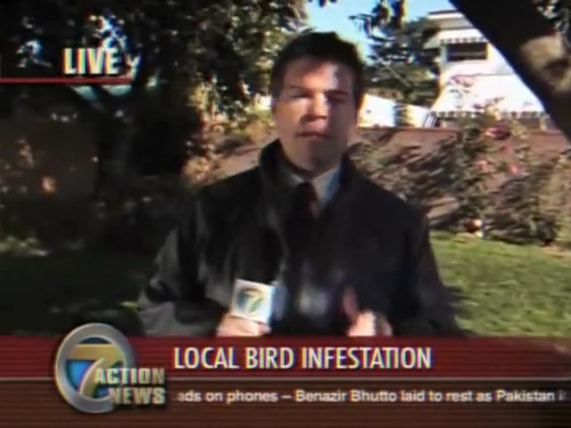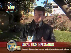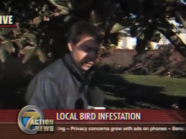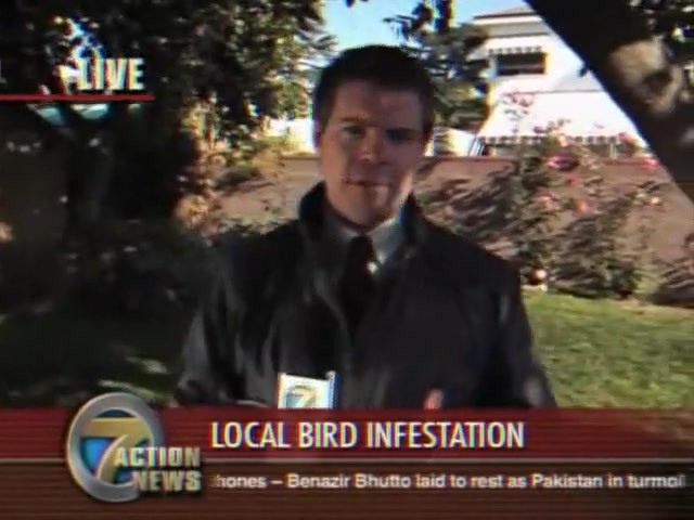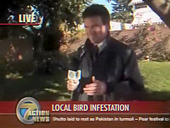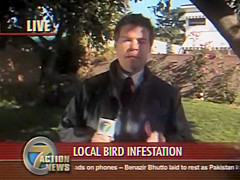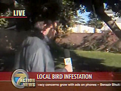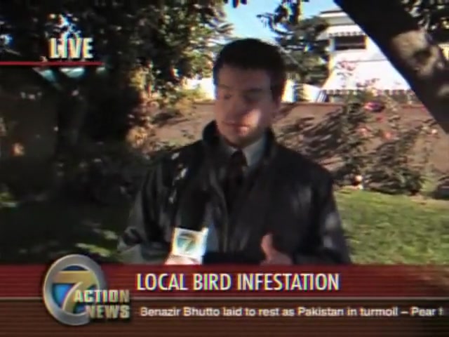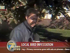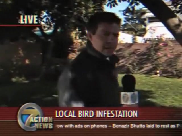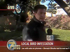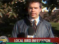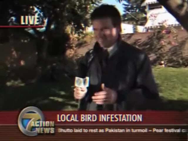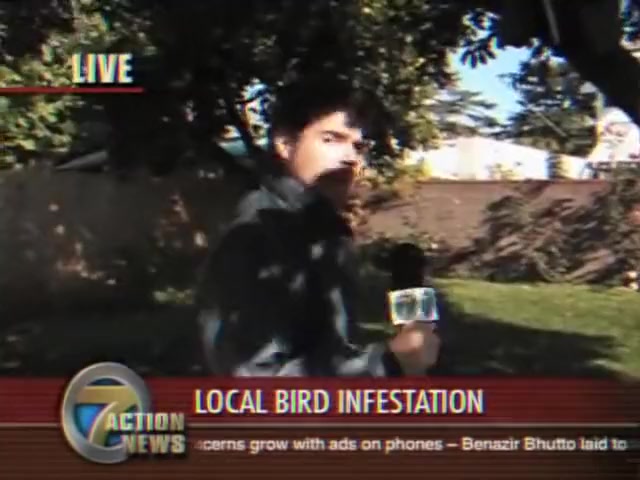 A reporter is doing live coverage when he gets poop on the shoulder then in the mouth..lol