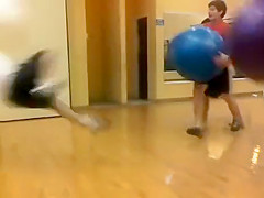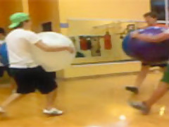 Four guys holding exercise balls run into each other at full speed and one of them gets launched across the gym floor.