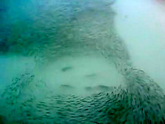 The sharks weave in and out of the school enjoying a tasty meal.