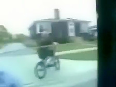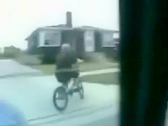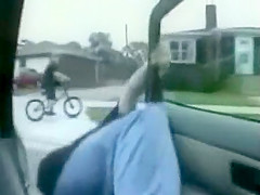 Stupid kid trying to knock other kids off their bikes and he falls out of the car.
