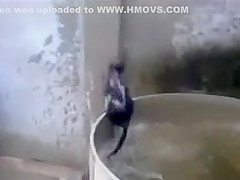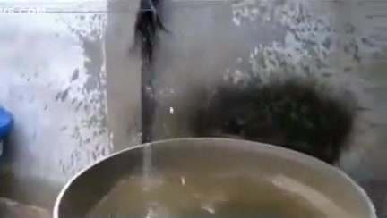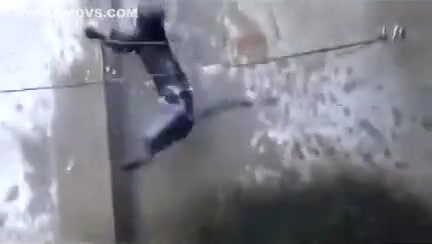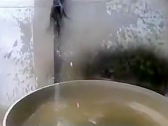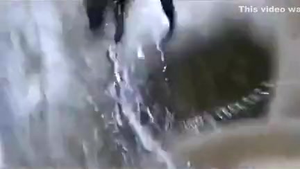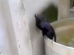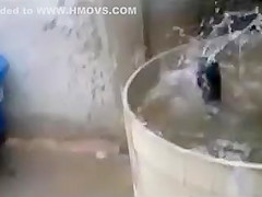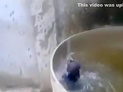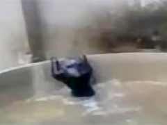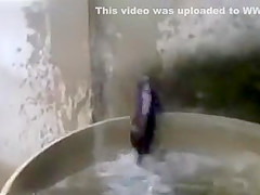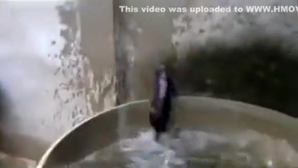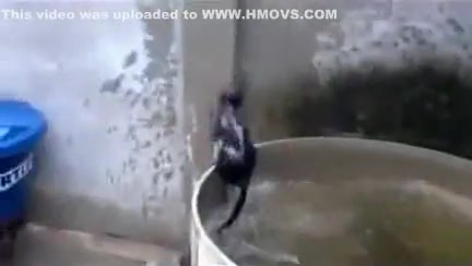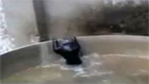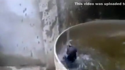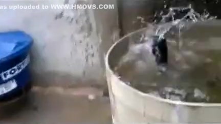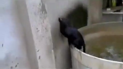 The cat is trying to jump up and get something but keeps falling into a giant tub of water.