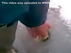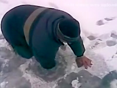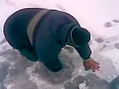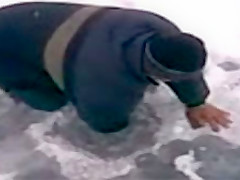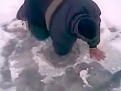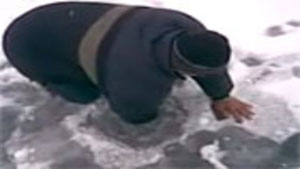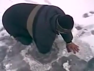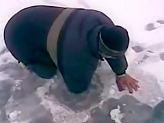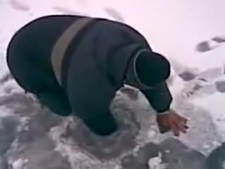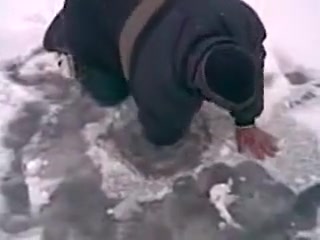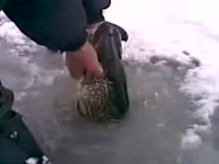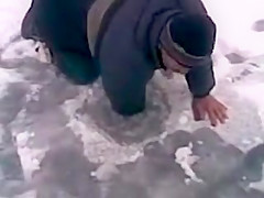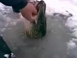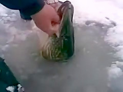 Dude reaches in the 4 inch ice fishing hole and pulls out a huge northern pike with his bare hands.