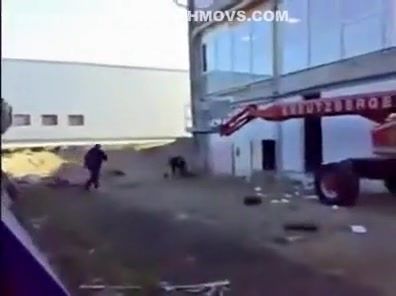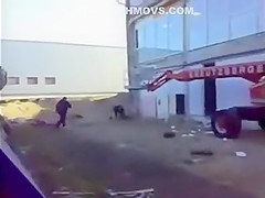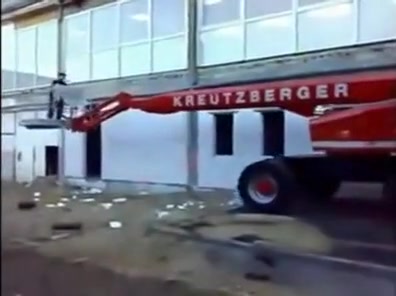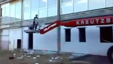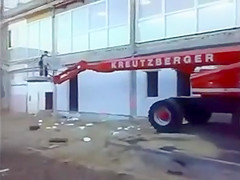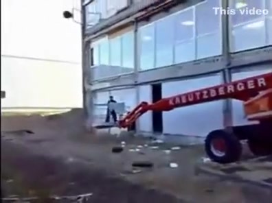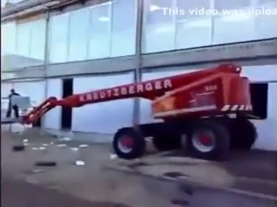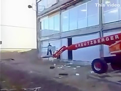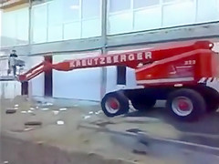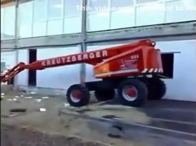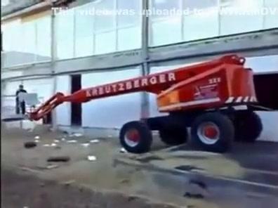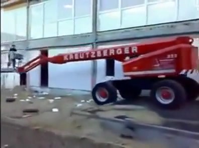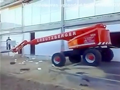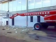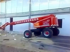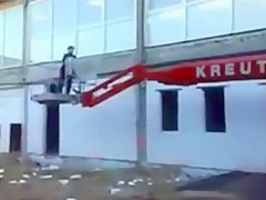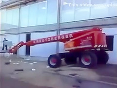 Watch what happens to this cherry picker operator after he goes over a speed bump.