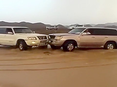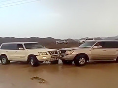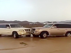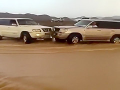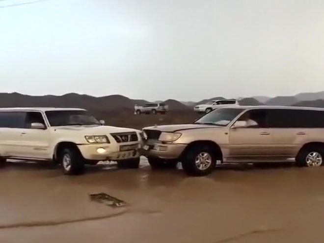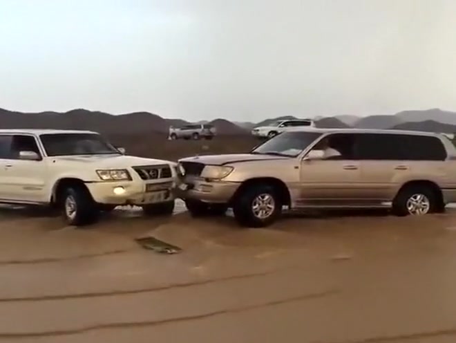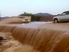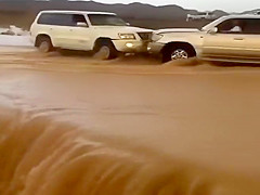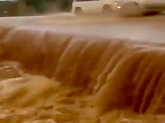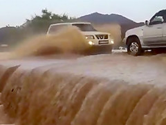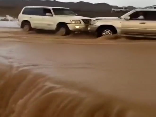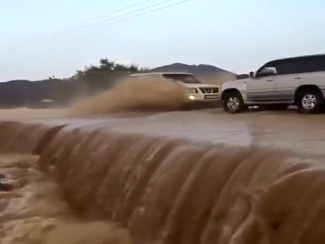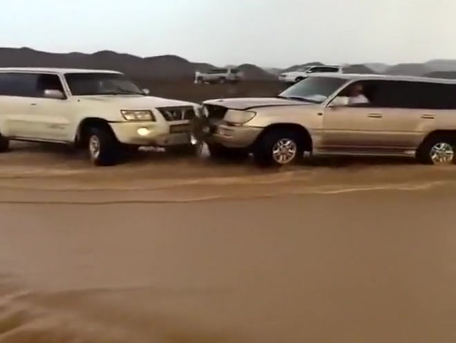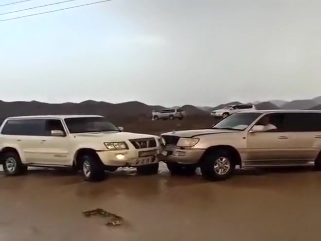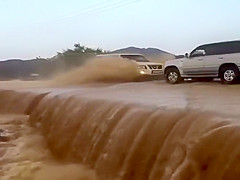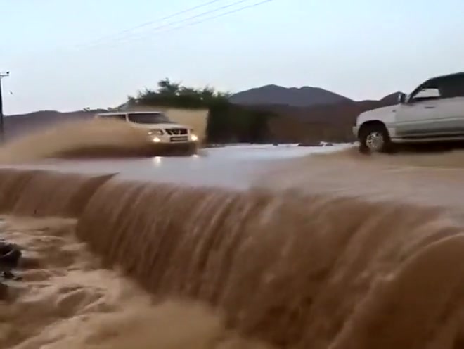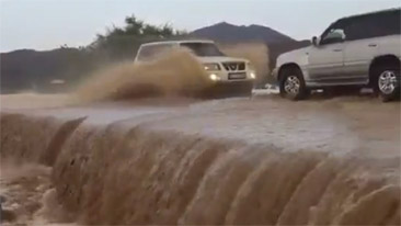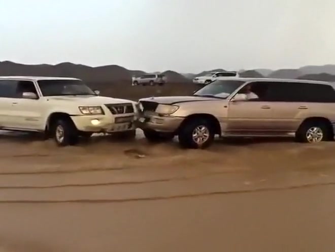 An idiot driver doesn't look where he's going during a flood and crashes head on with another car.