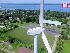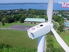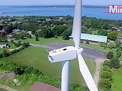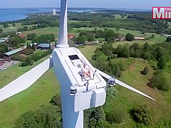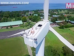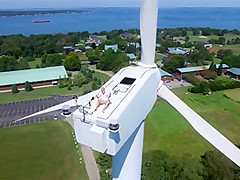 Meanwhile on top of a giant wind turbine a man catches some rays.