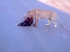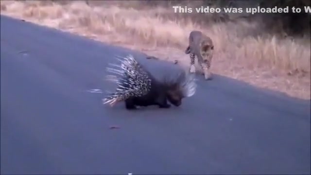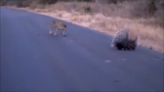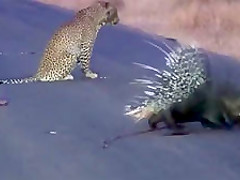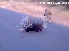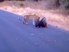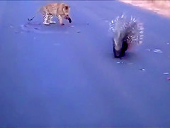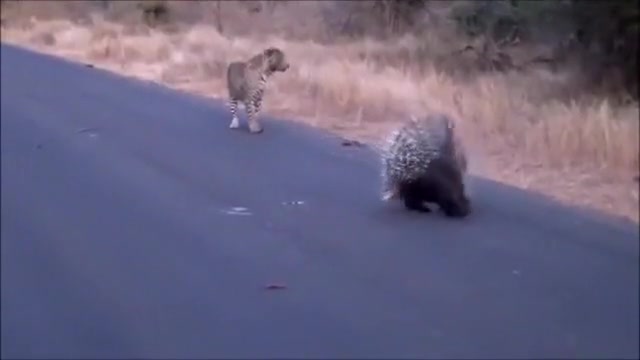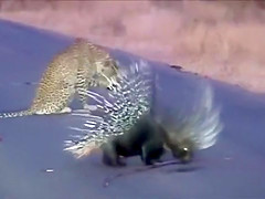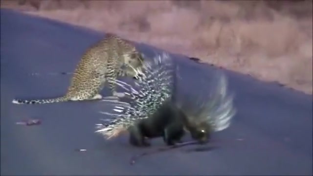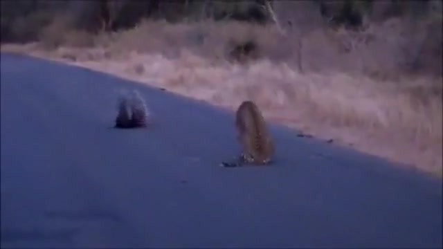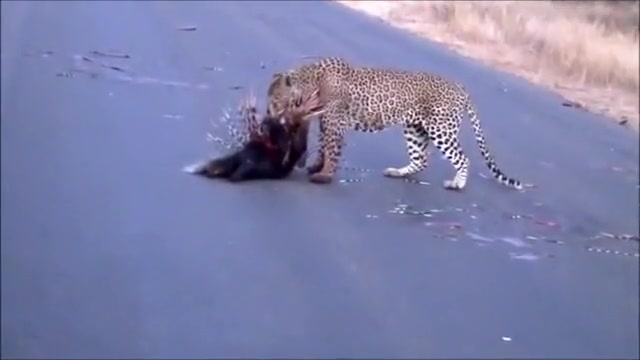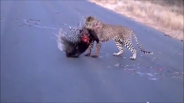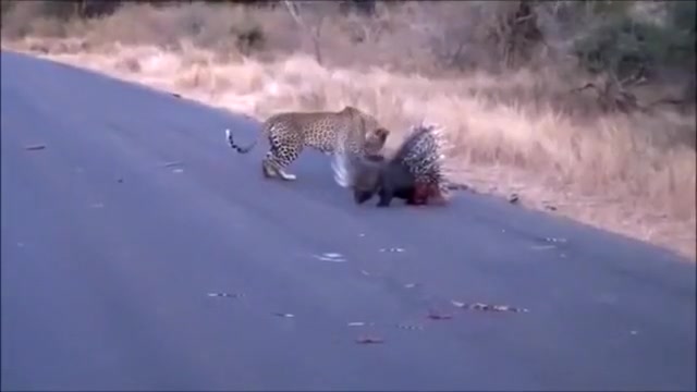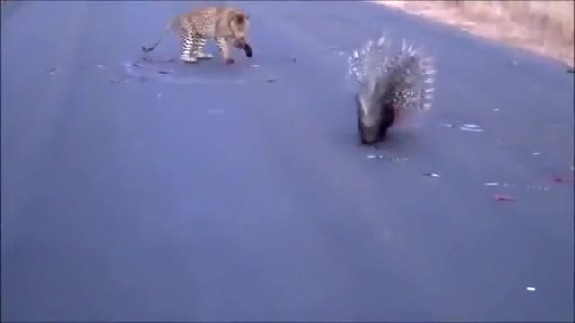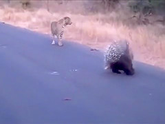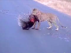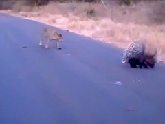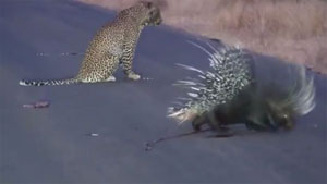 Watch a leopard and porcupine do battle in the middle of the road.