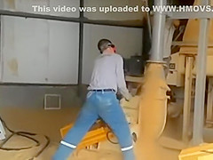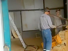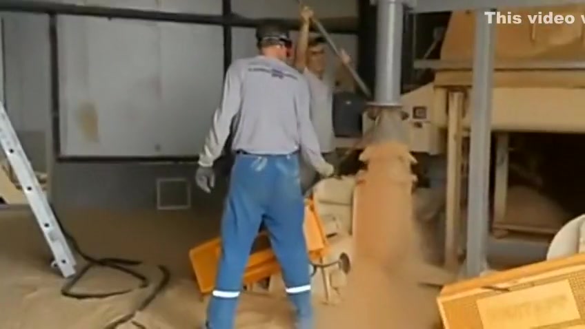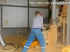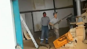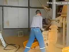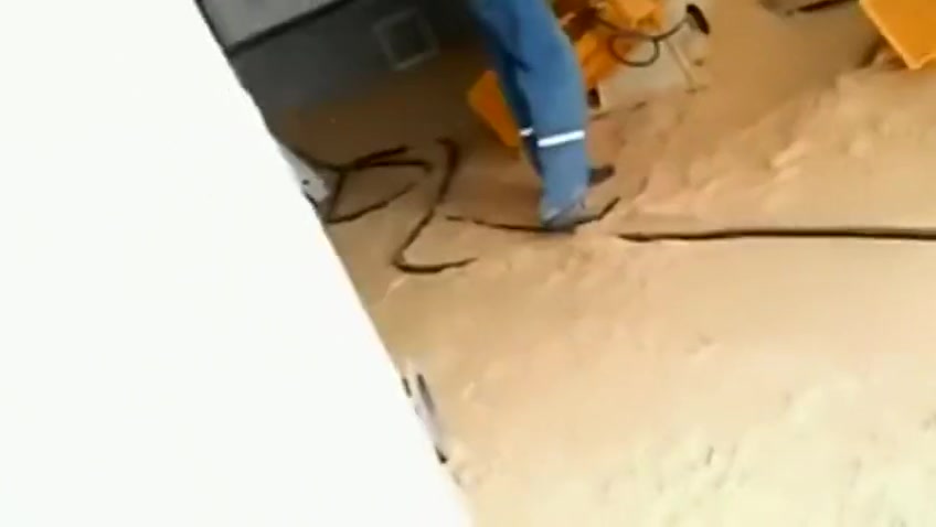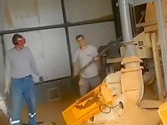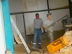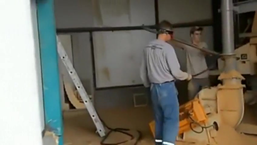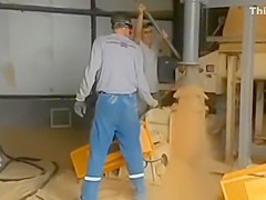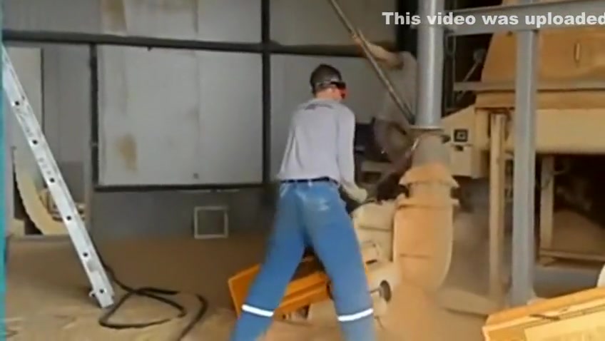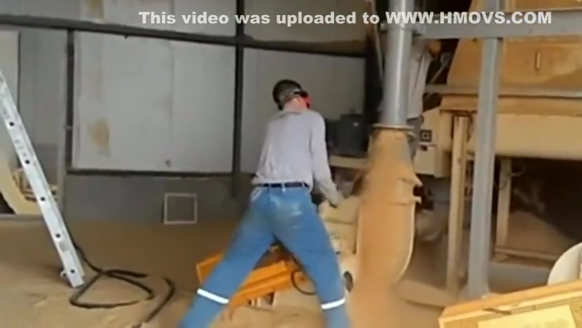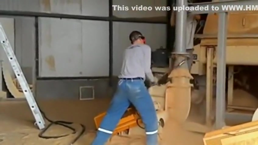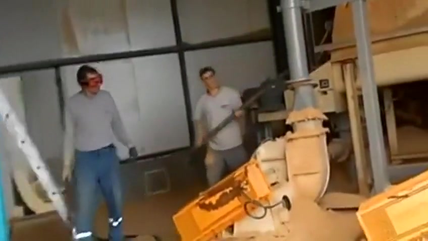 A factory pipe explodes while workers are trying to unclog it. Kinda looks like sawdust.