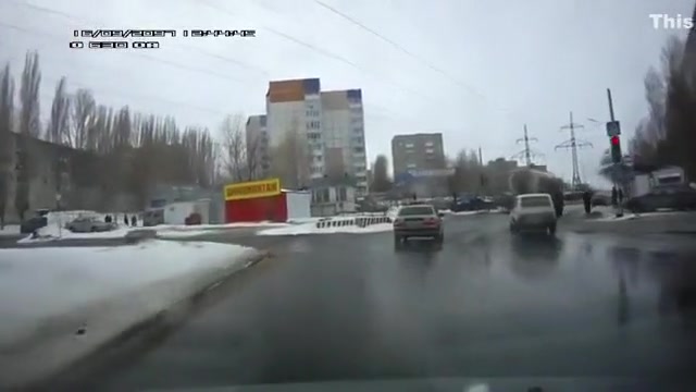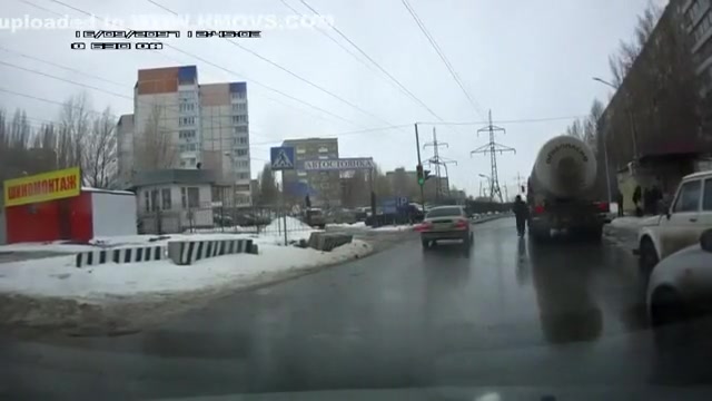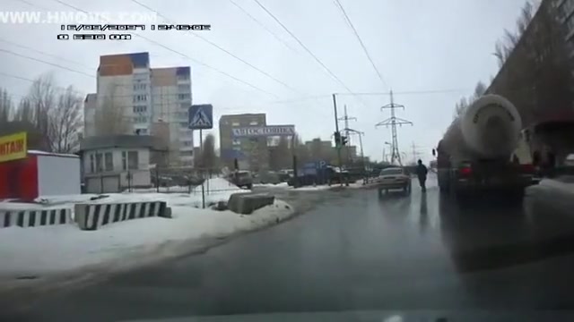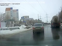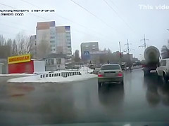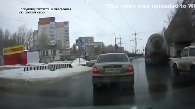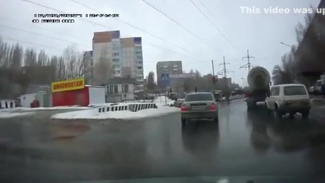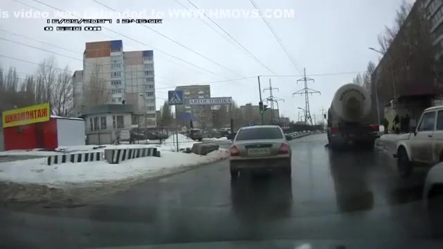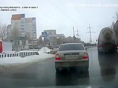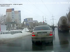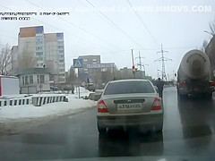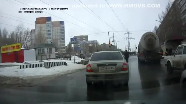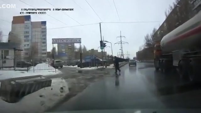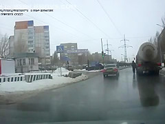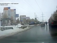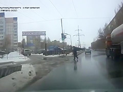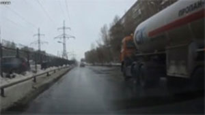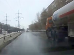 Crazy Russian tries to jump under a tanker's tires.