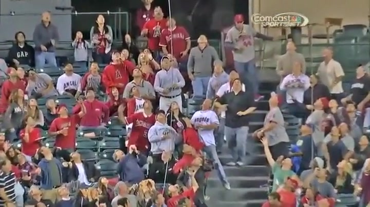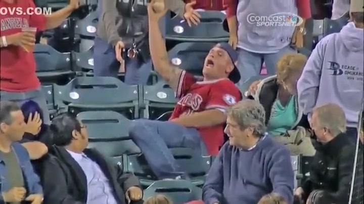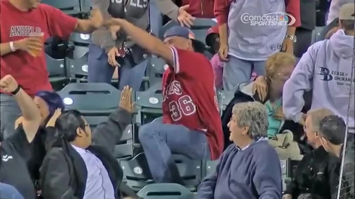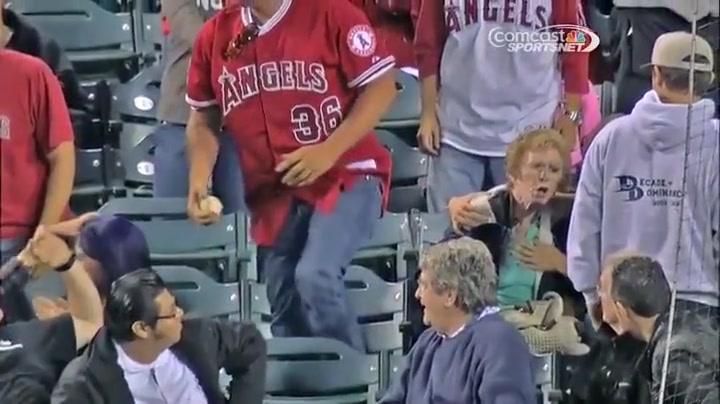 An old woman got crushed when a fan jumped on top of her to catch a foul ball.