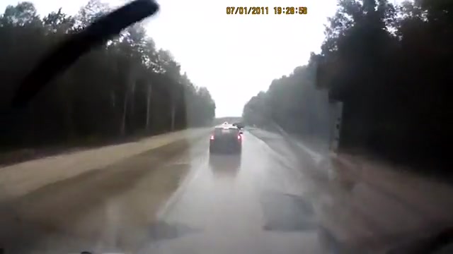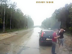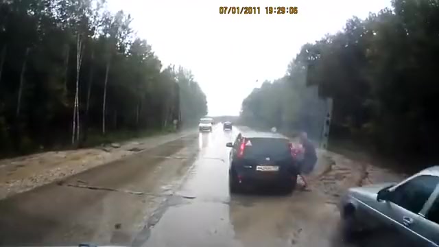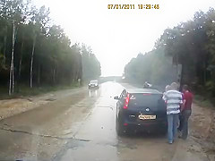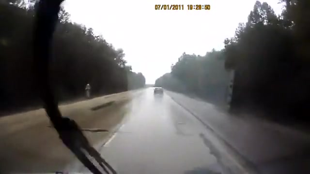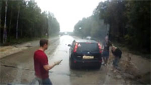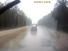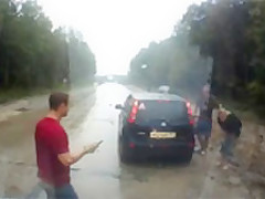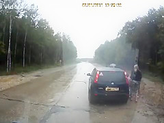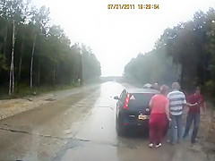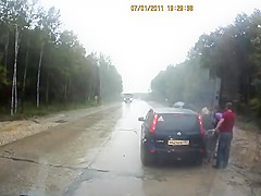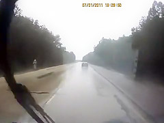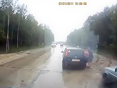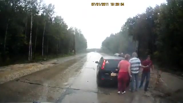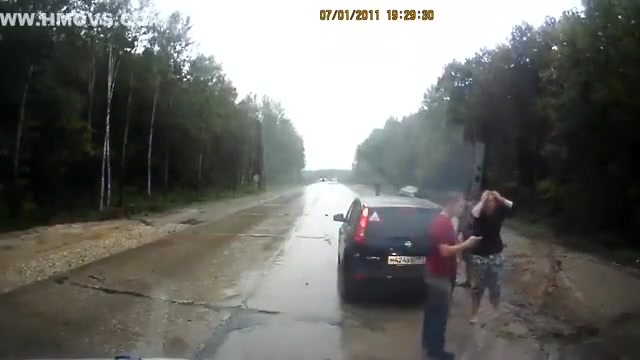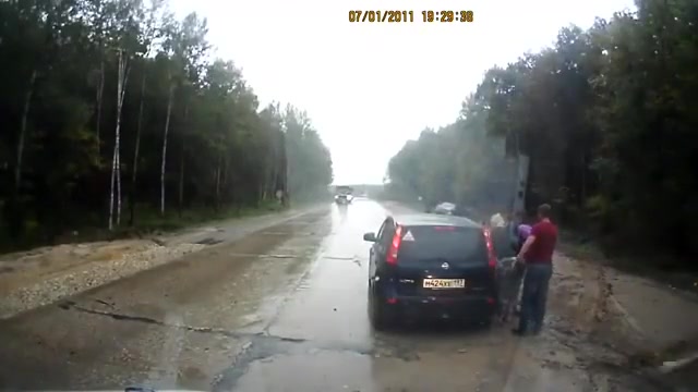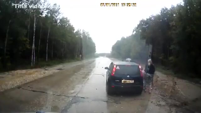 Miraculously a father and his son escape unharmed from a violent crash while stopped to take a pee. Next time pull over a little farther!