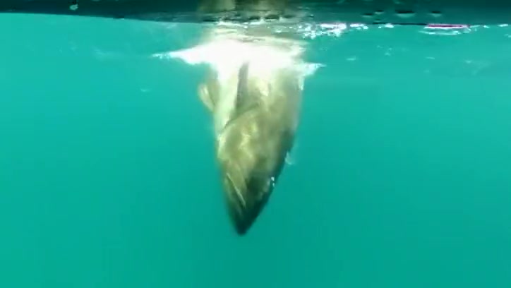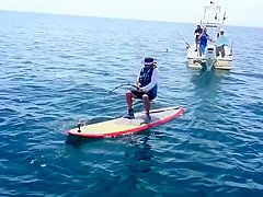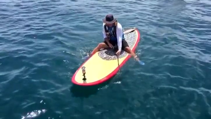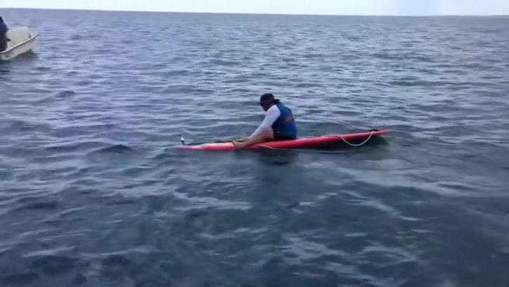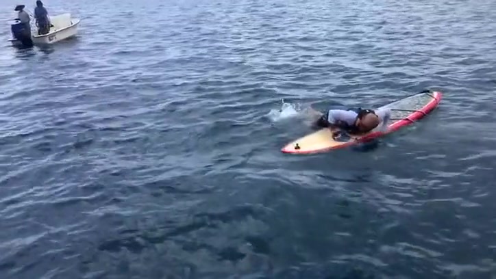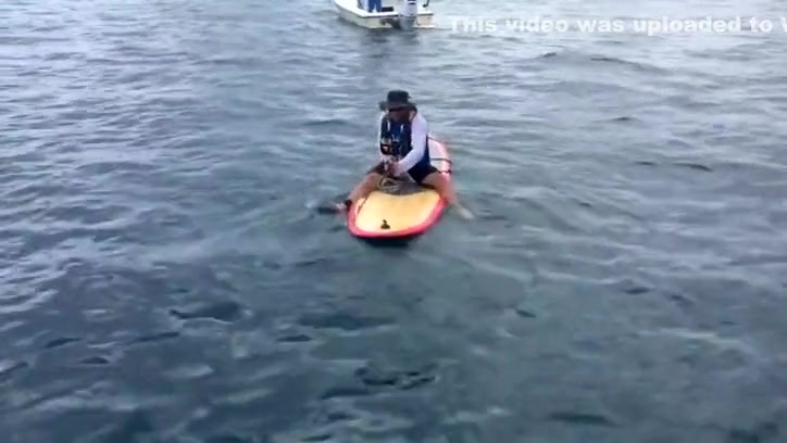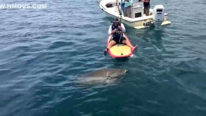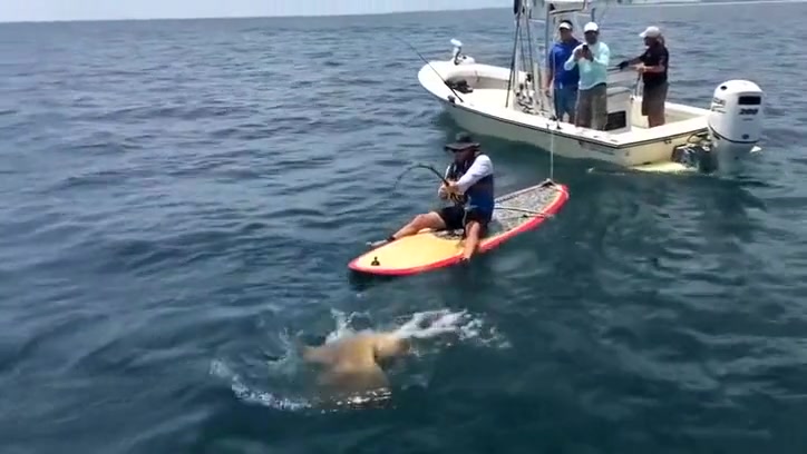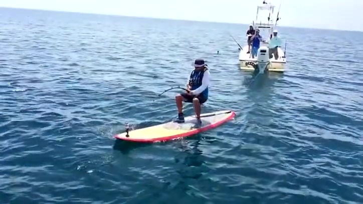 A Florida man reels in a giant 7ft grouper from his paddle board.