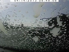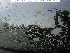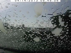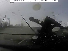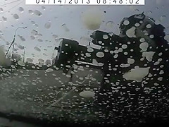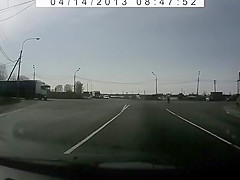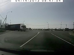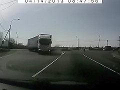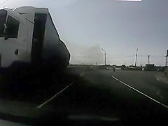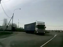 A woman is calmly sitting at a light when all of a sudden a 18 wheeler comes along and drops her off a gift.