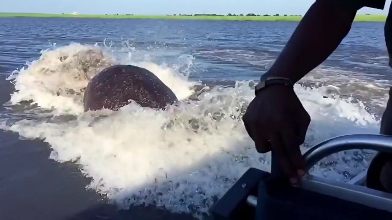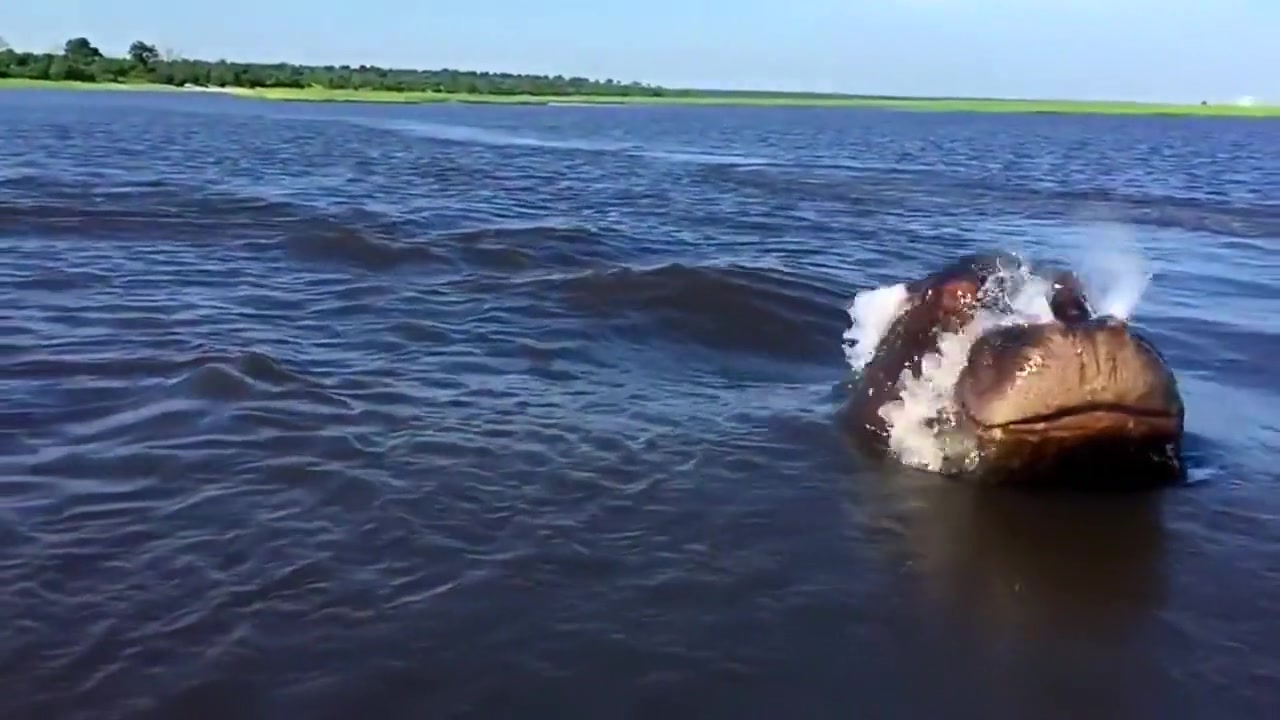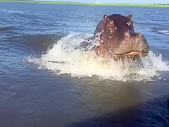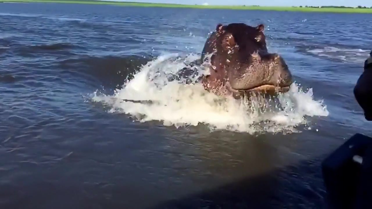 Giant Angry Hippo Charges Boat On The River