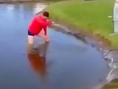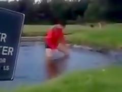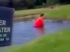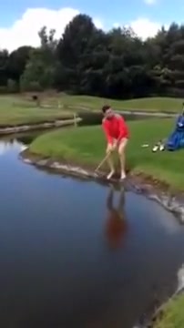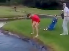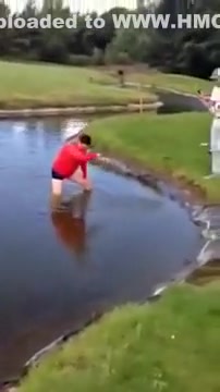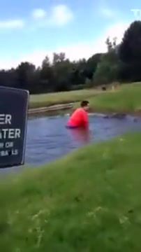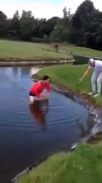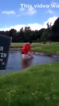 This dude takes a bath in a water hazard and can't get out.