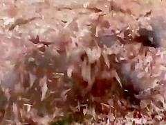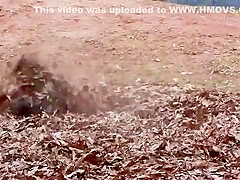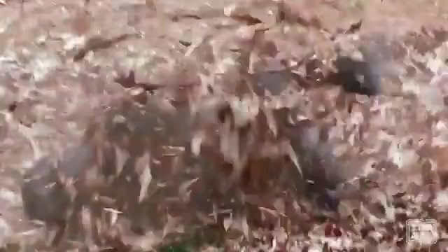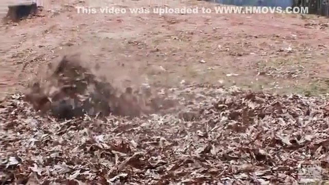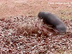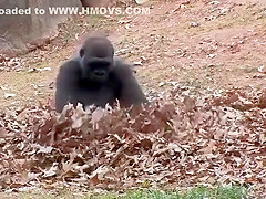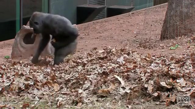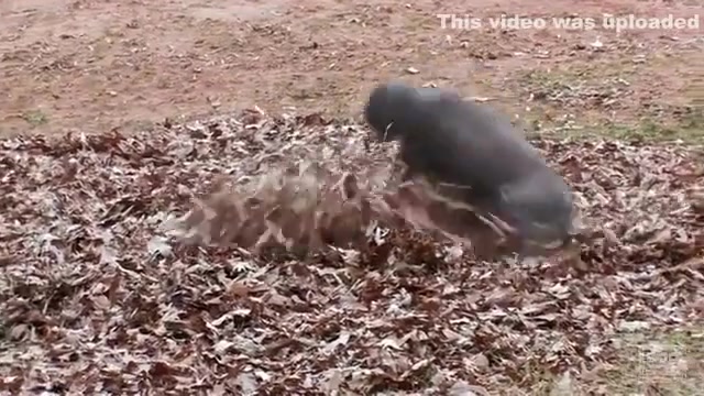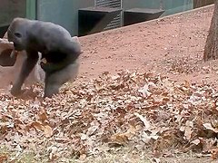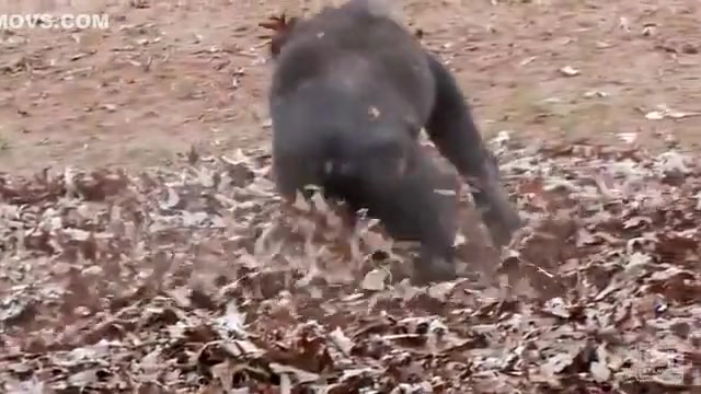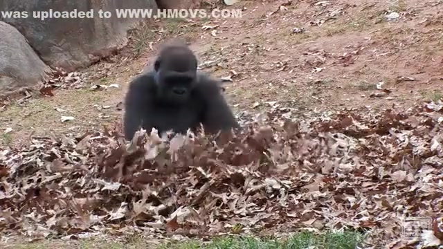 This ape goes apeshit in a pile of leaves.