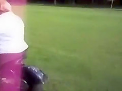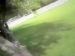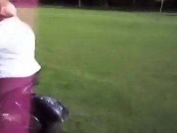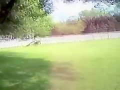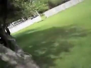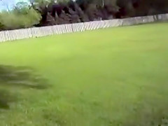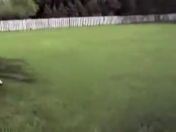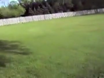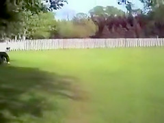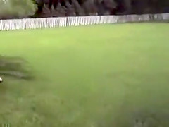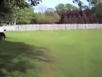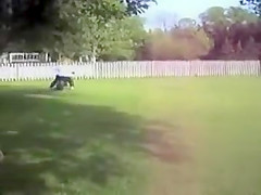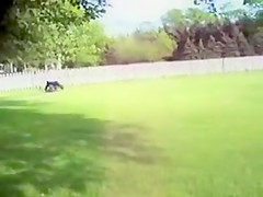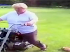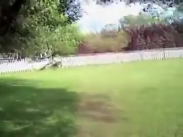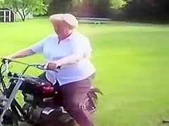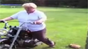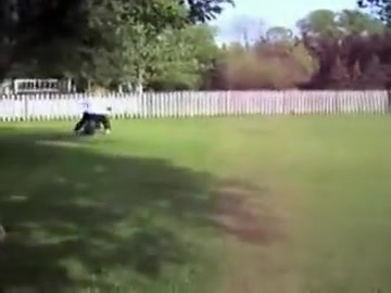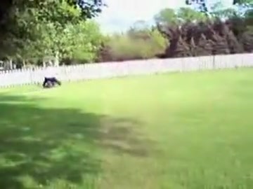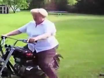 She don't know how to ride a motorcycle and takes off through the yard and into the fence.