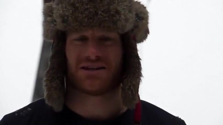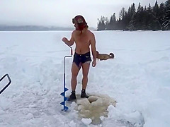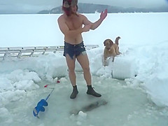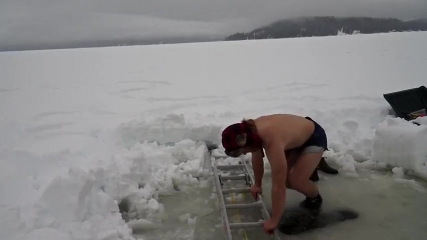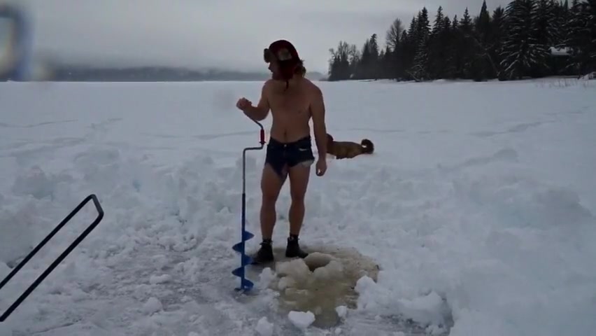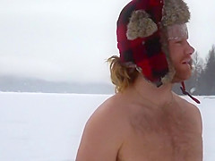 Crazy Canadians challenging each other to jump into a frozen lake.