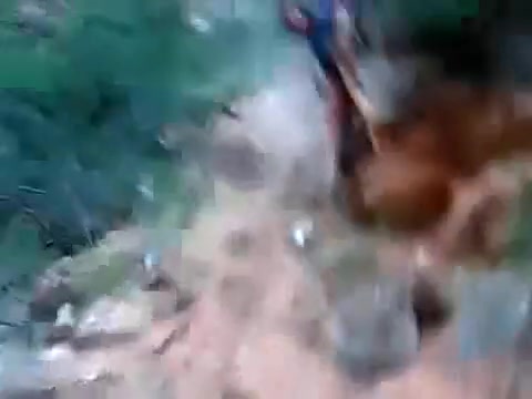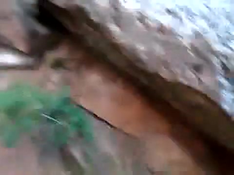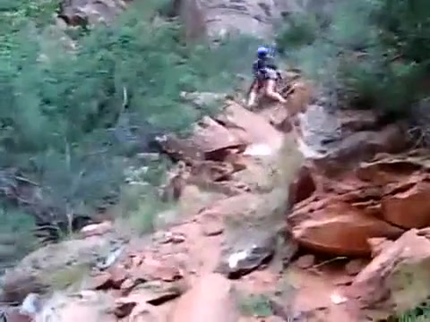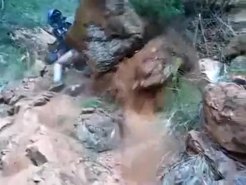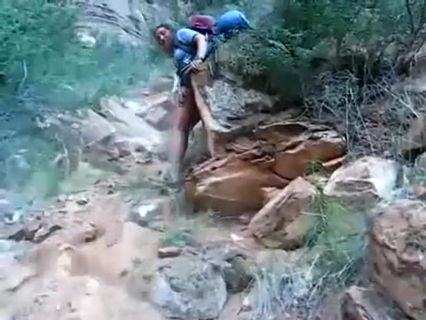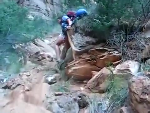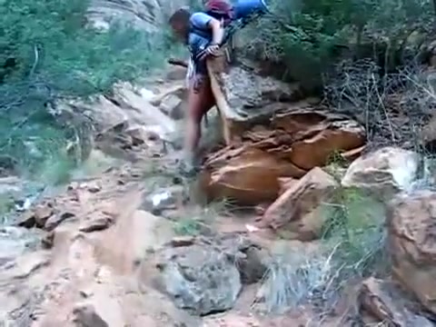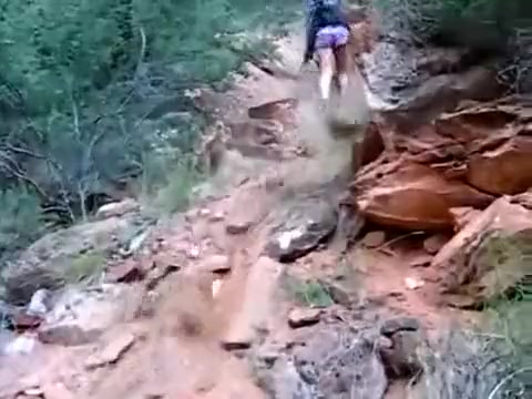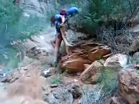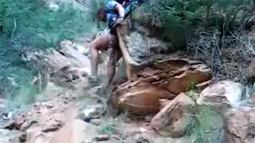 A boulder gives way and almost flattens the guy behind the camera.