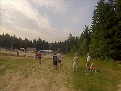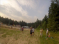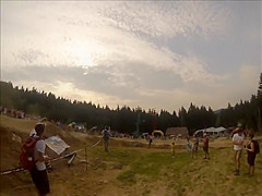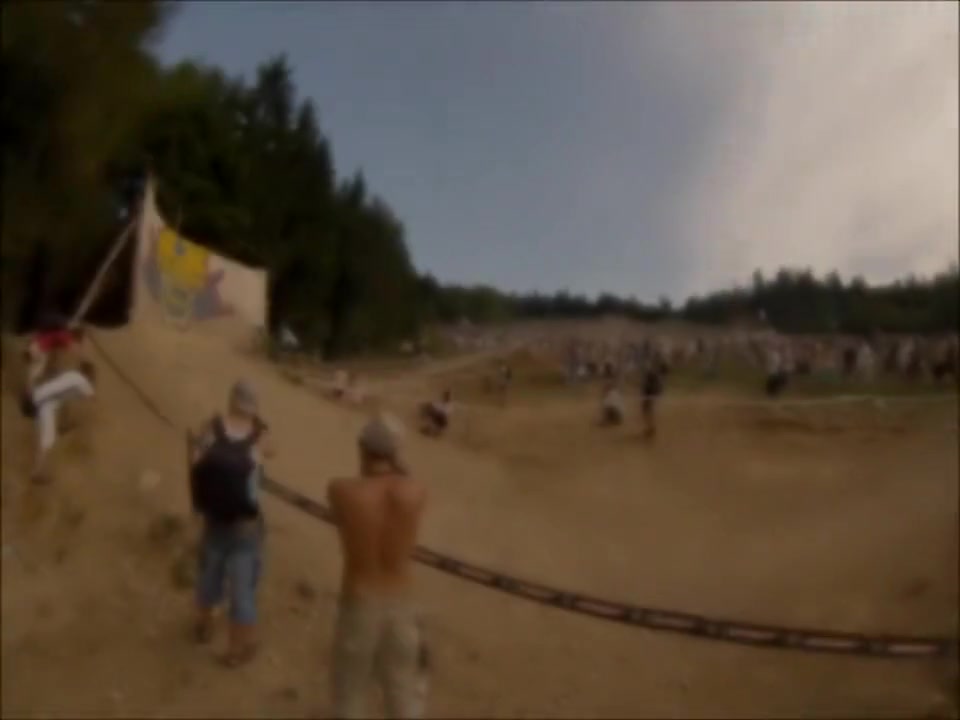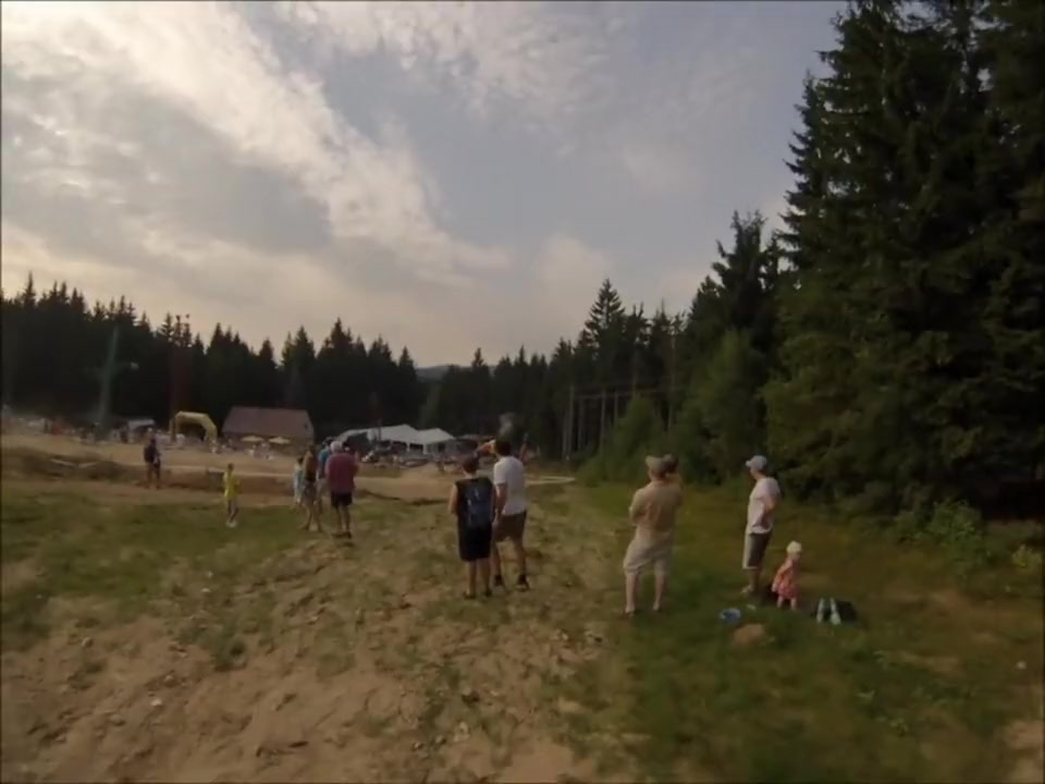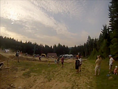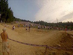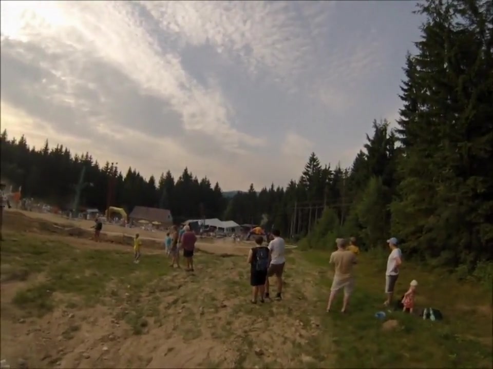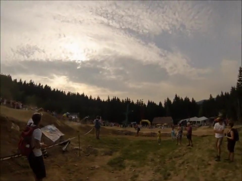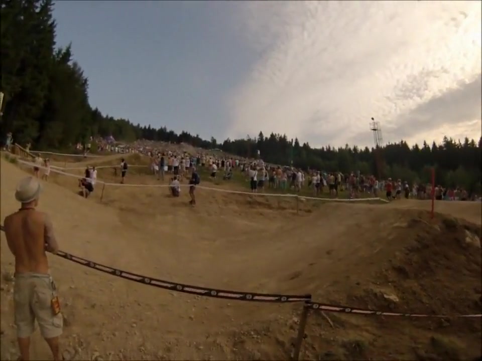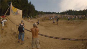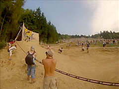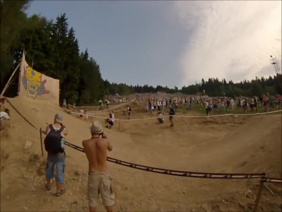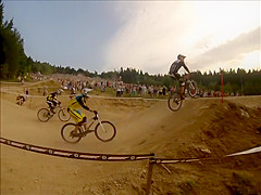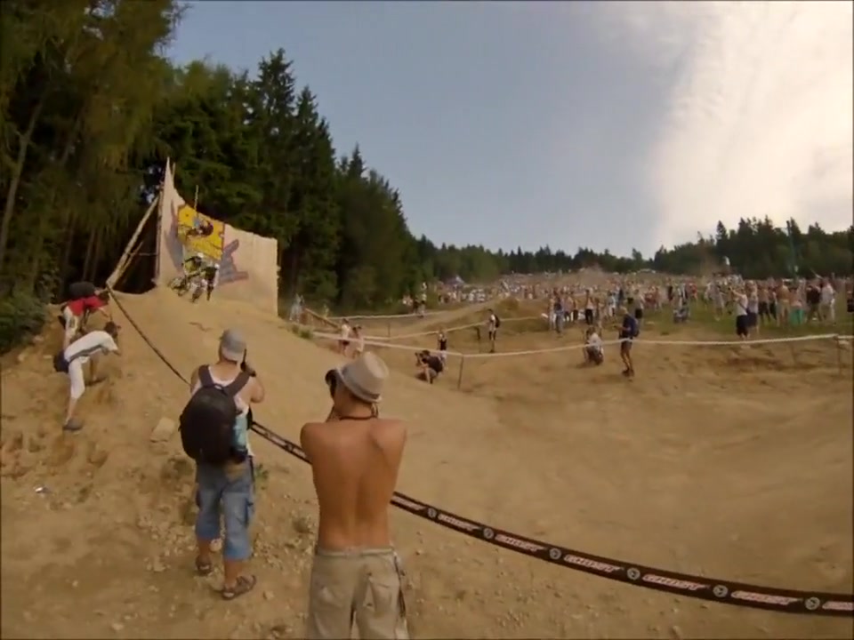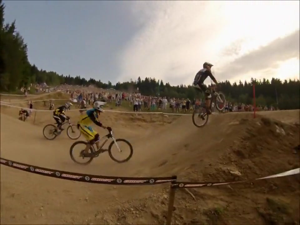 This guy passes 2 other bikers by pulling off a sweet wallride to take the lead.