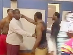 A brawl breaks out on the court between a couple old dudes and some young men.