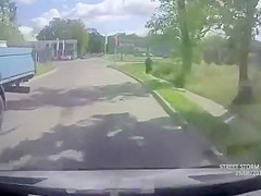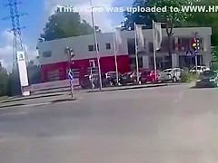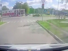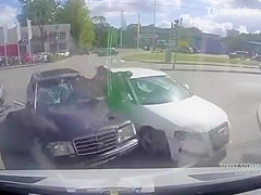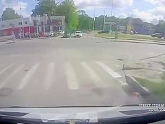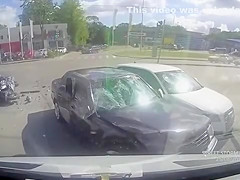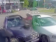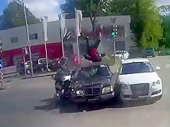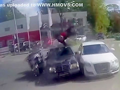 A guy on a motorcycle speeds through an intersection and collides with a car sending him flying onto the windshield of two cars.