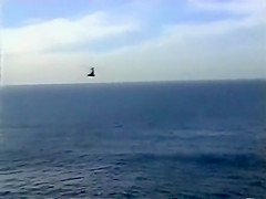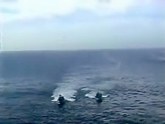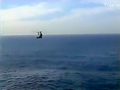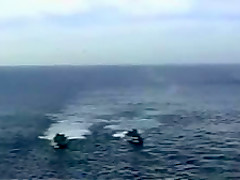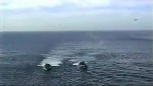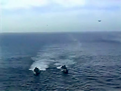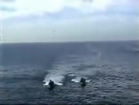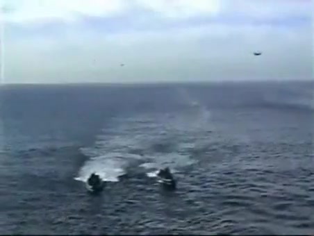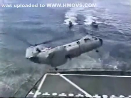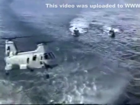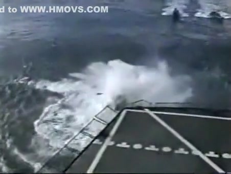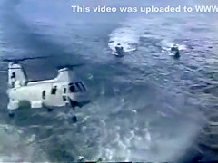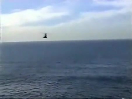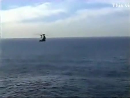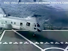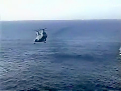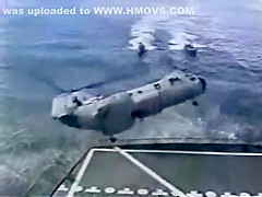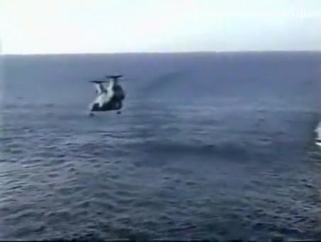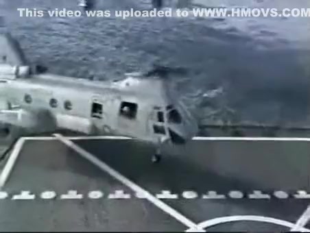A Navy Helicopter tries to land on a ship but malfuntions and goes overboard.