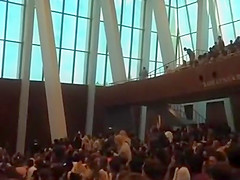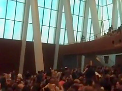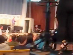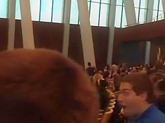 A bald eagle tries to make a run for it while flying inside an auditorium.