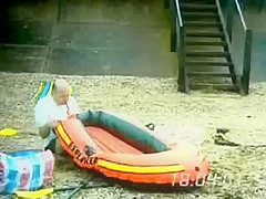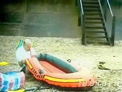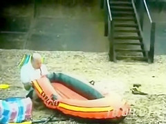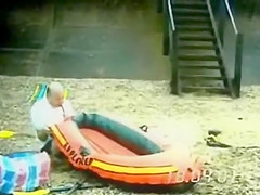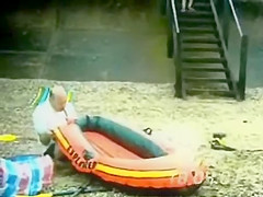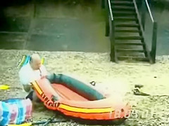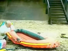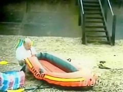 This poor guy lost his head after his kid jumped on the raft he was blowing up.