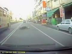A scooter driver ricochets off a car door and in front of a bus.