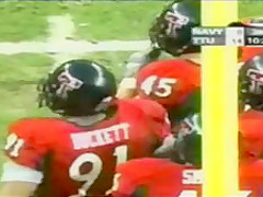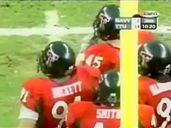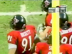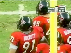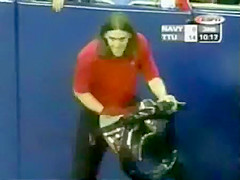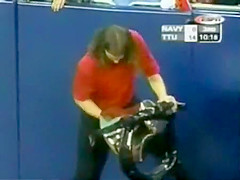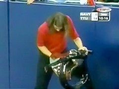 This guy is ringing a bell at a football game but it looks like he is doing a bit more!