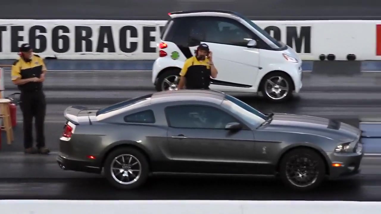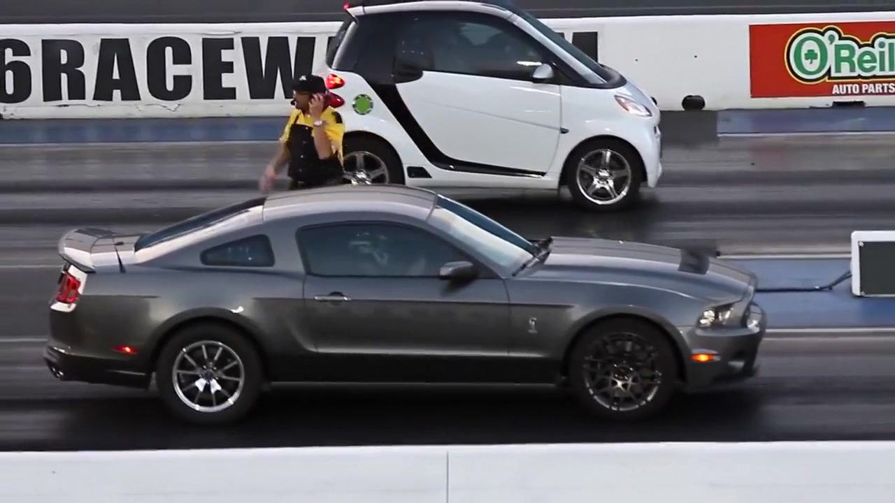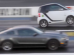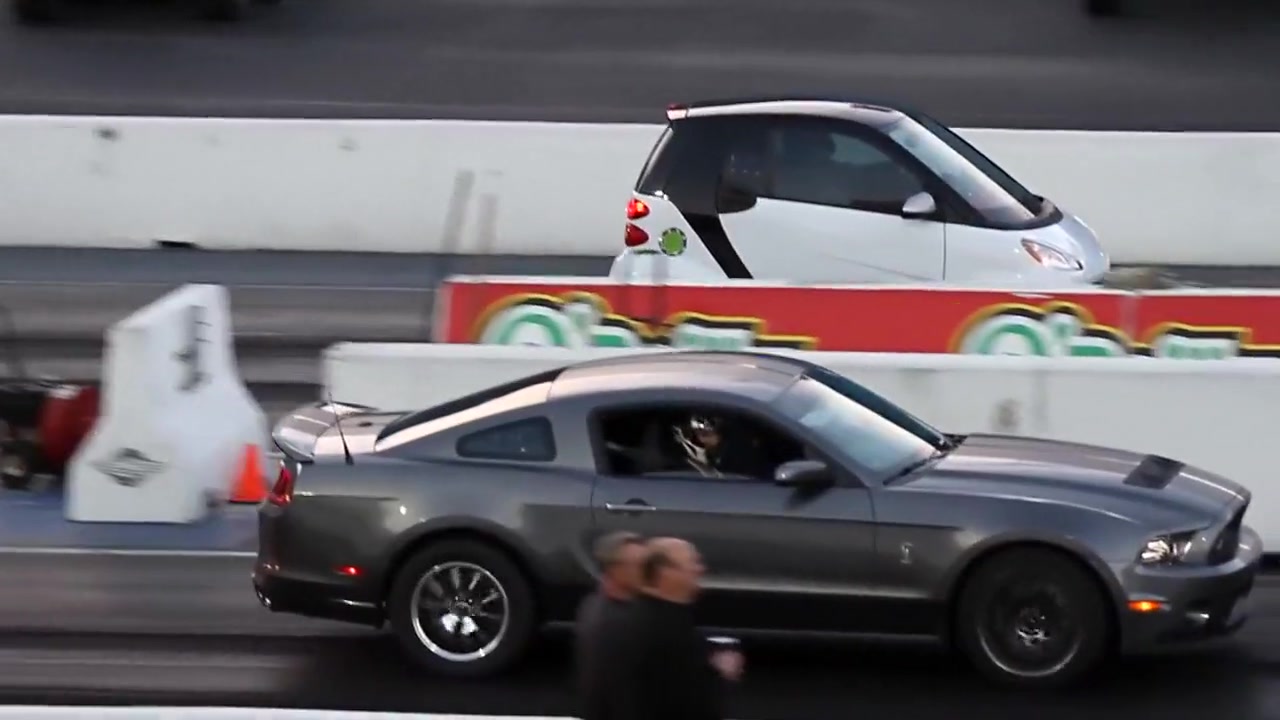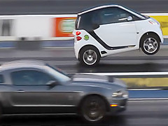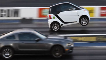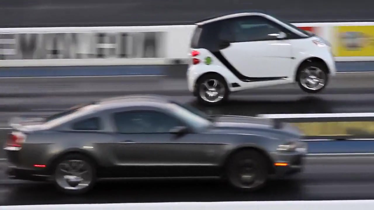 Watch to see a smart car take a mustang off the line and pop wheelie in the process!