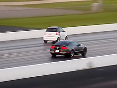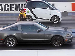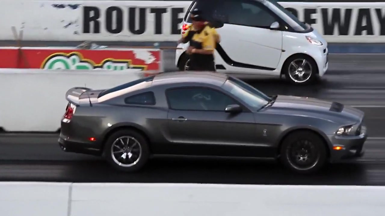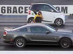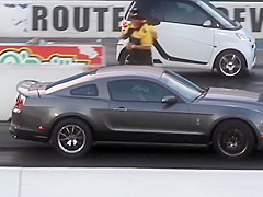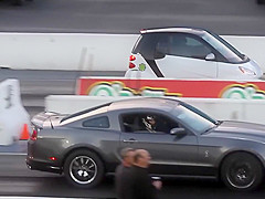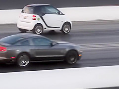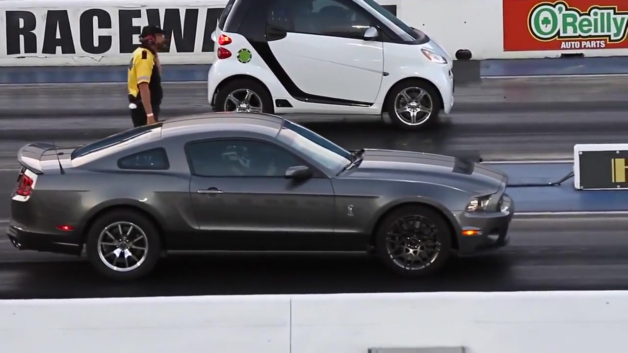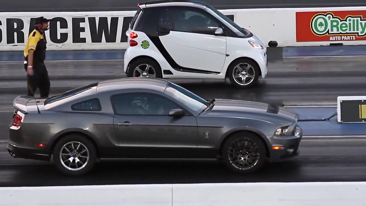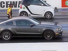 Watch to see a smart car take a mustang off the line and pop wheelie in the process!