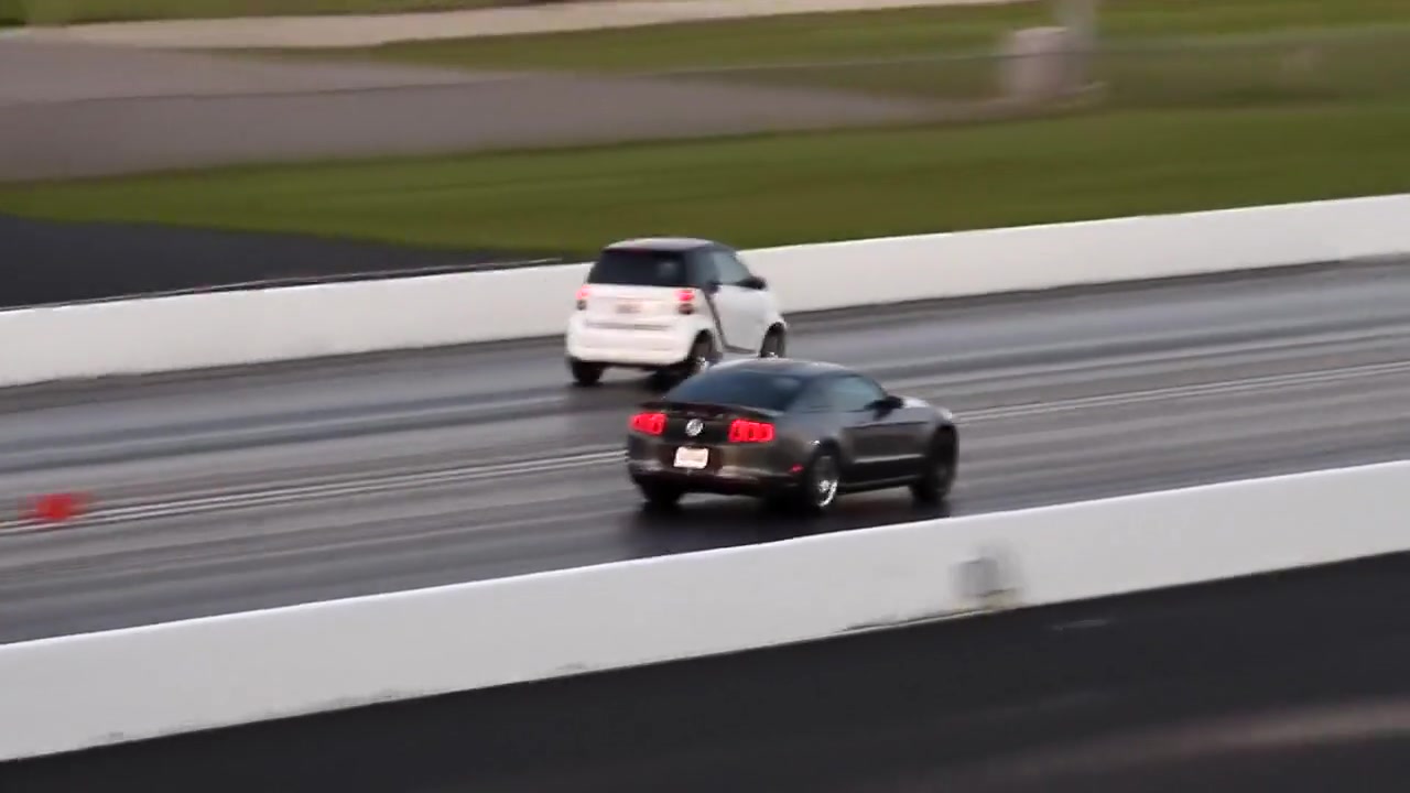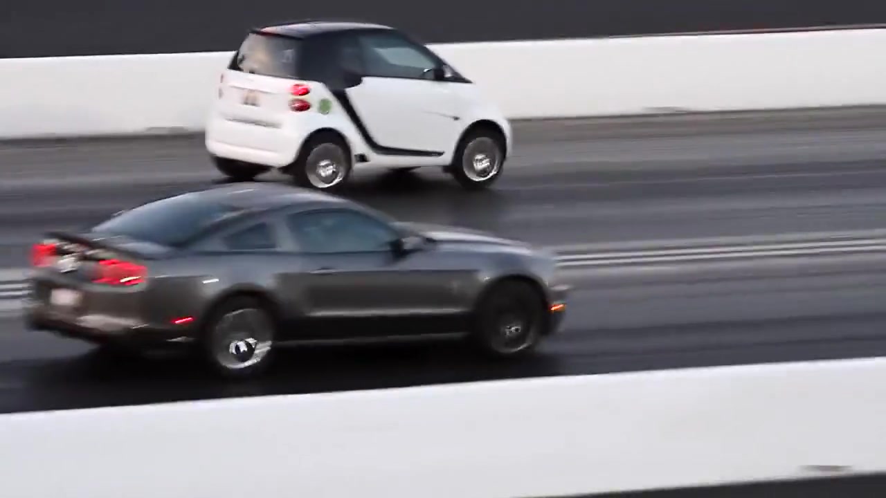 Smart Car Pops a Wheelie and Smokes Mustang Off The Line