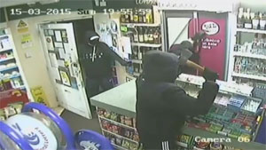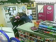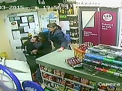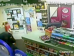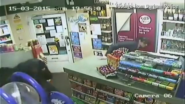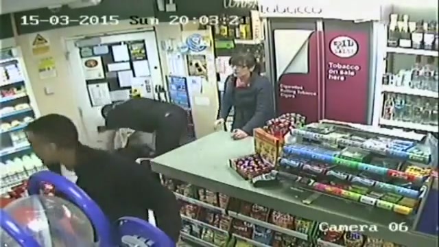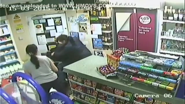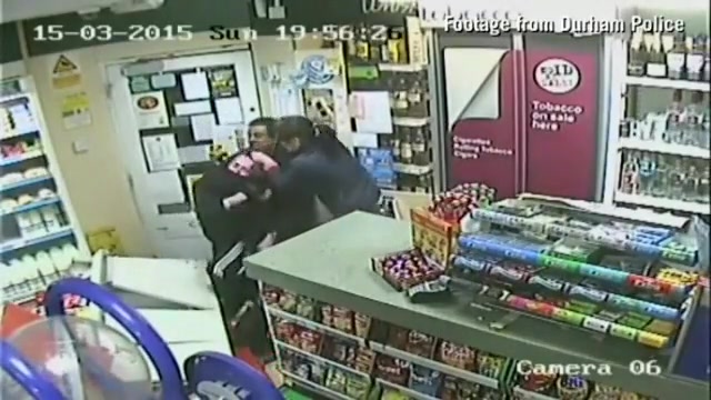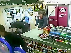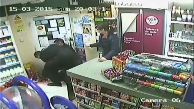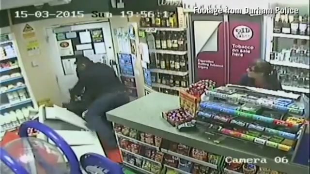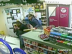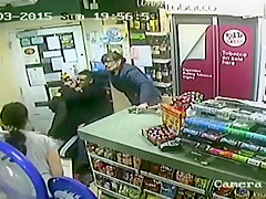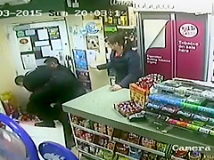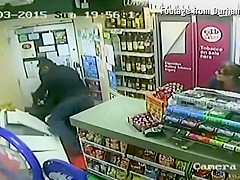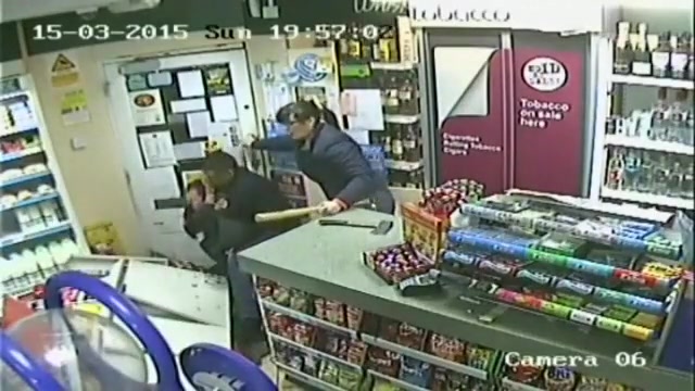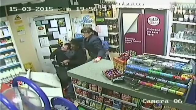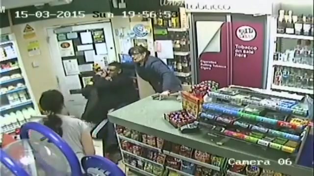 A customer leaps into action when an axe wielding man tries to rob the store.