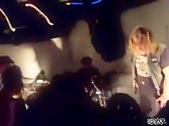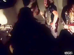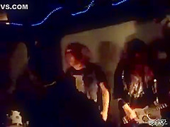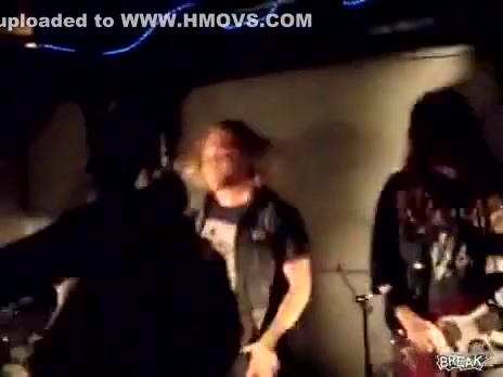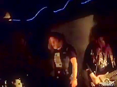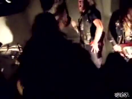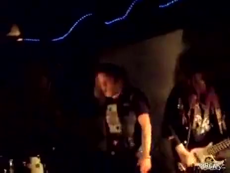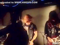 A Swedish rock band singer pukes multiple times on stage but continues to try and sing.