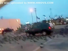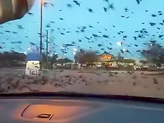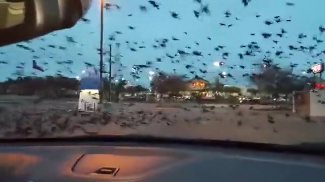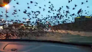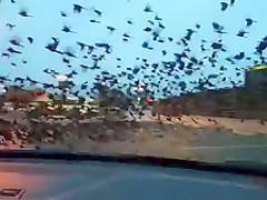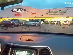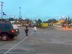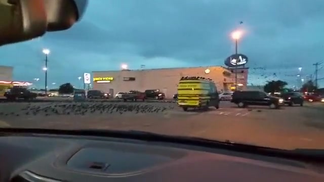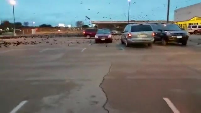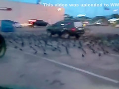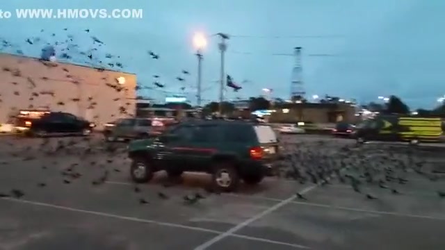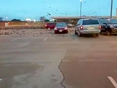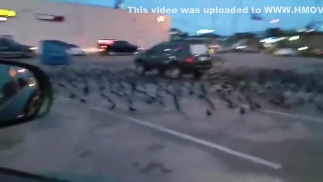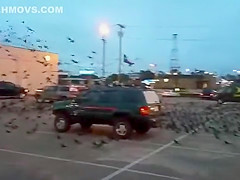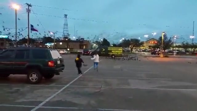 A couple attempts to reclaim a parking lot from an infestation of birds.